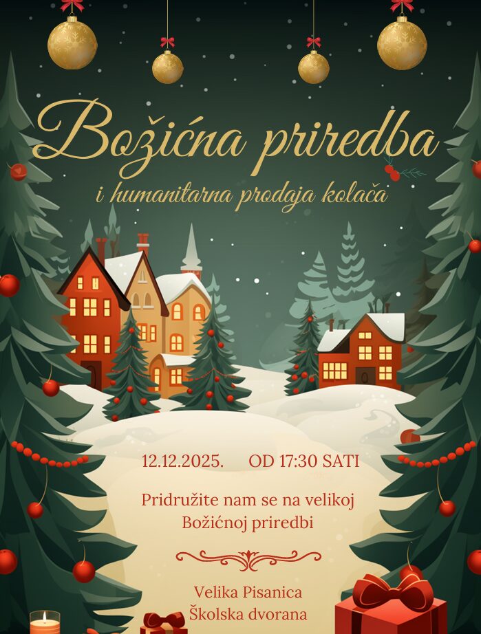 Čast nam je i osobito zadovoljstvo pozvati Vas na Božićnu priredbu OŠ Velika Pisanica i humanitarnu prodaju kolača koja će se održati u petak, 12. prosinca 2025. godine s početkom u 17.30 sati u školsko sportskoj dvorani u Velikoj Pisanici.